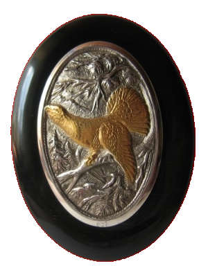 Motiv : Auerhahn II teilvergoldet Silber : 935 / 000 Größe : 40 mm x 26,5 mm Abschlusskappe Kunststoff: 53 mm x 40 mm |